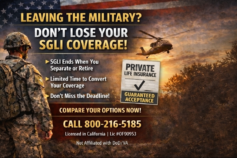 SGLI usually ends when you separate or retire, and any free extension is temporary. Don’t wait—missing the conversion window can mean higher costs or medical underwriting. I’ll help you understand your options, including VGLI conversion and private life insurance alternatives, so you can keep protection in place without a gap. Call/Text 800-216-5185. Licensed in California. Lic #0F90953. Not affiliated with DoD/VA